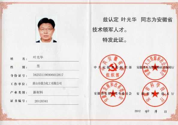 2012年公司总经理叶光华同志被认定为安徽省技术领军人才