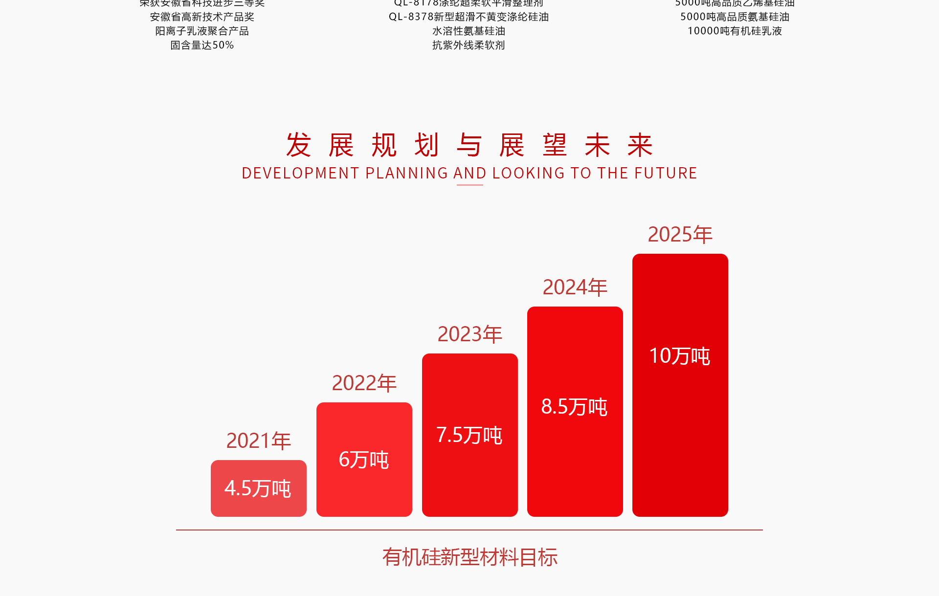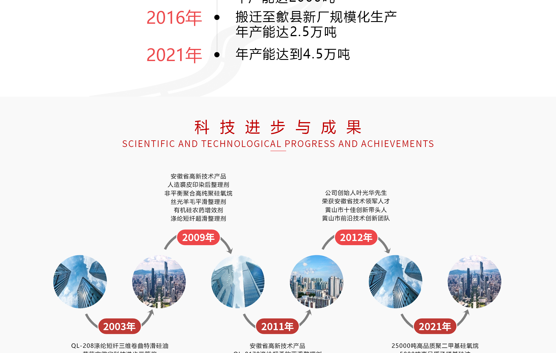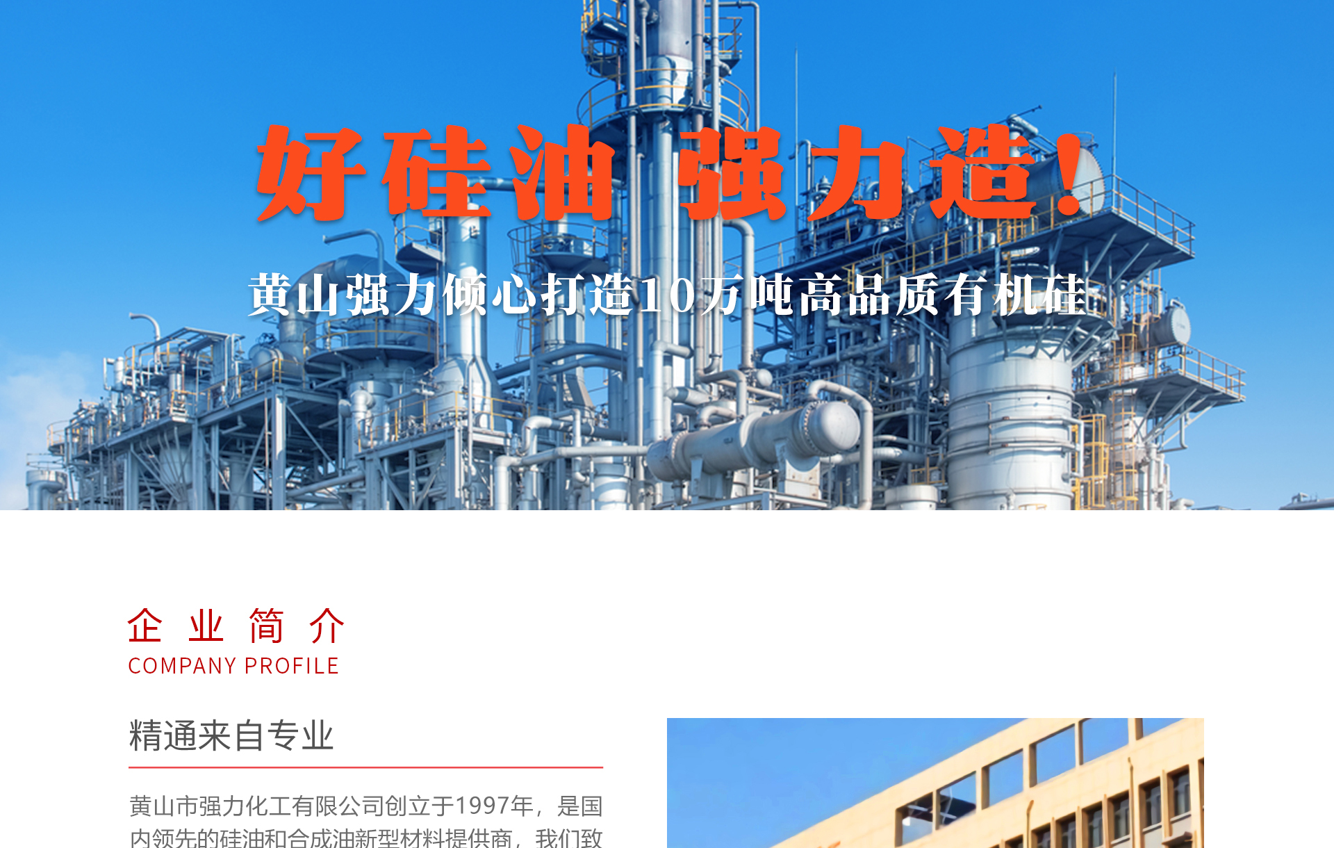 黄山强力化工有限公司成立于1997年,由叶光华先生创办,是一家以硅树脂聚酯纤维为一体,解决了碳纤维生产中存在的问题的研发生产型企业。公司坐落于安徽省黄山市歙县循环经济园区纬一路23号,占地面积30000平方米,拥有优秀的研发团队,先进的生产设备以及敬业专业的员工,是质量与发展的保证!企业主要焦点在21世纪是硅油聚酯短纤维和硅酮液体,主要以硅油、二甲基硅油、聚二甲基硅氧烷、氨基硅油、乙烯基硅油、羟基硅油、硅乳液、D4、DMC、MM等产品专业生产加工,拥有完整、科学的质量管理体系。公司致力于与创新与开拓,不断升级生产线与时俱进,更新换代,实现产能与质量有质的飞跃。目前拥有24H集散控制系统自动化生产系统,二十条生产流水线,产能以硅油、乳液及配方生产能力超过30000吨/年。研发部门也积极开拓思路,研发出多种属于自己的新产品:有机硅微乳液、乙烯基聚二甲基硅氧烷、含氢聚二甲基硅氧烷等。另外,公司也积极寻求多渠道多发展的可持续发展道路,维持线下业务销售途径不断壮大的同时,也紧抓线上机遇与商机。从2020年起,正式成立了强力化工广州办事处,以融入珠三角经济圈谋求更好的发展,实现对内销售与对外贸易相结合更上一层楼。与此同时,办事处也正式成立了电商部以应对线上营销推广的专业渠道,通过阿里巴巴中文站与国际站,扎根国内市场,不断开拓海外市场,届时已经取得一定的成果;公司销售占比有:64%国内市场,海外份额占比36%。望公司同仁齐心协力更进一步,也期待各方客户鼎力支持。
