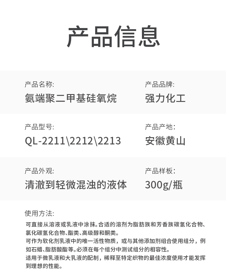 氨基硅油是专门用于纺织品柔软整理剂的基本成份.它具有最佳的吸附性、相容性及易乳化性.使用混合器或均质机,氨基硅油容易被适当的表面活性剂乳化成稳定、透明的微乳液.它可以单独使用,也可以与其它有机硅或有机柔软剂组合成为特殊的柔软整理剂,适用於各种纺织品的柔软整理。