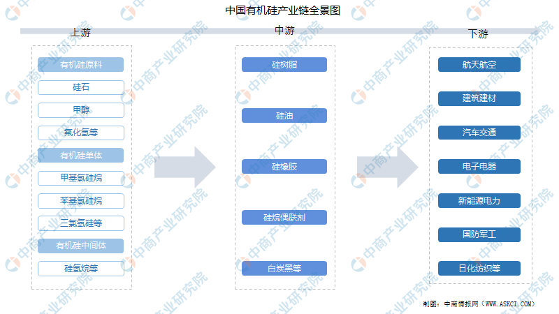 有机硅产业链上游为有机硅原料、有机硅单体及有机硅中间体;中游包括硅树脂、硅油、硅橡胶、硅烷偶联剂、白炭黑等;下游应用广泛,主要把控航天航空、建筑建材、汽车交通、电子电器、新能源电力、国防军工、日化纺织等。