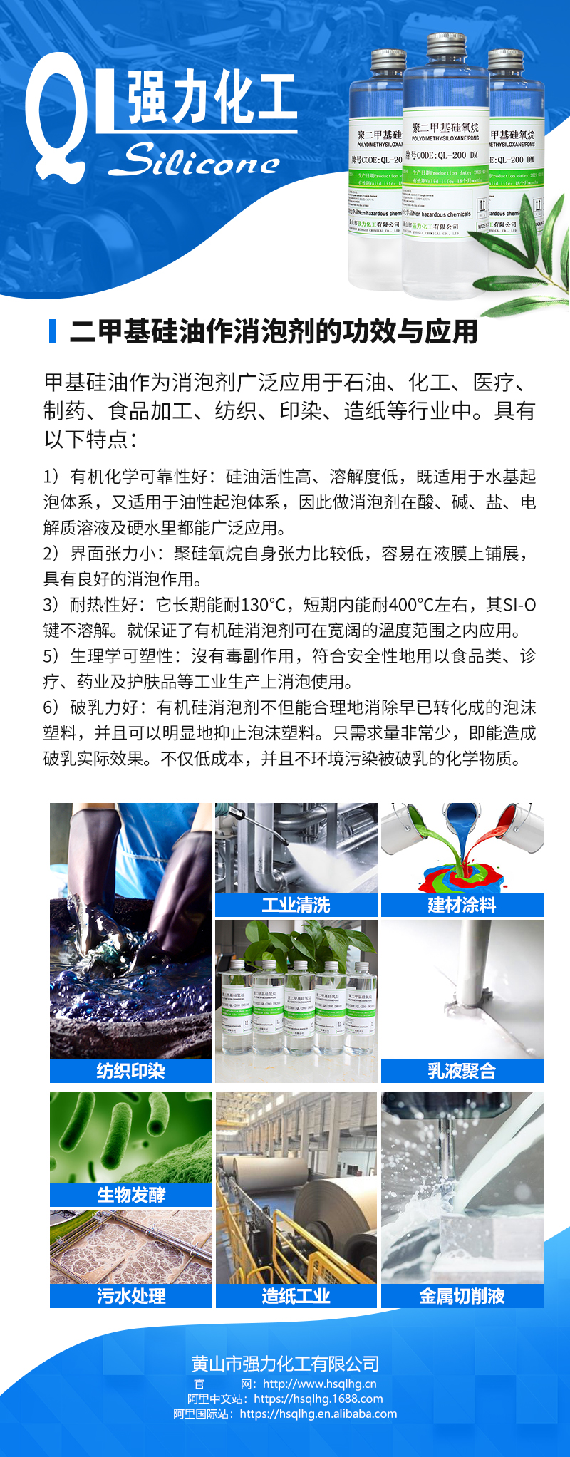 有机硅消泡剂是一种白色粘稠的乳液。从60年代起就用于各工业领域,但大规模和全面的快速发展是从80年代开始的。作为有机硅消泡剂,其应用领域也十分广泛,越来越受到各行各业的重视。在化工、造纸、涂料、食品、纺织、制药等工业部门有机硅消泡剂是生产过程中不可缺少的一种助剂,它不仅能够除去生产过程工艺介质液面上的泡沫,从而改善过滤、洗涤、萃取、蒸馏、蒸发、脱水、干燥等工艺过程的分离、气化、排液等效果,确保各类物料盛装、处理容器的容量。