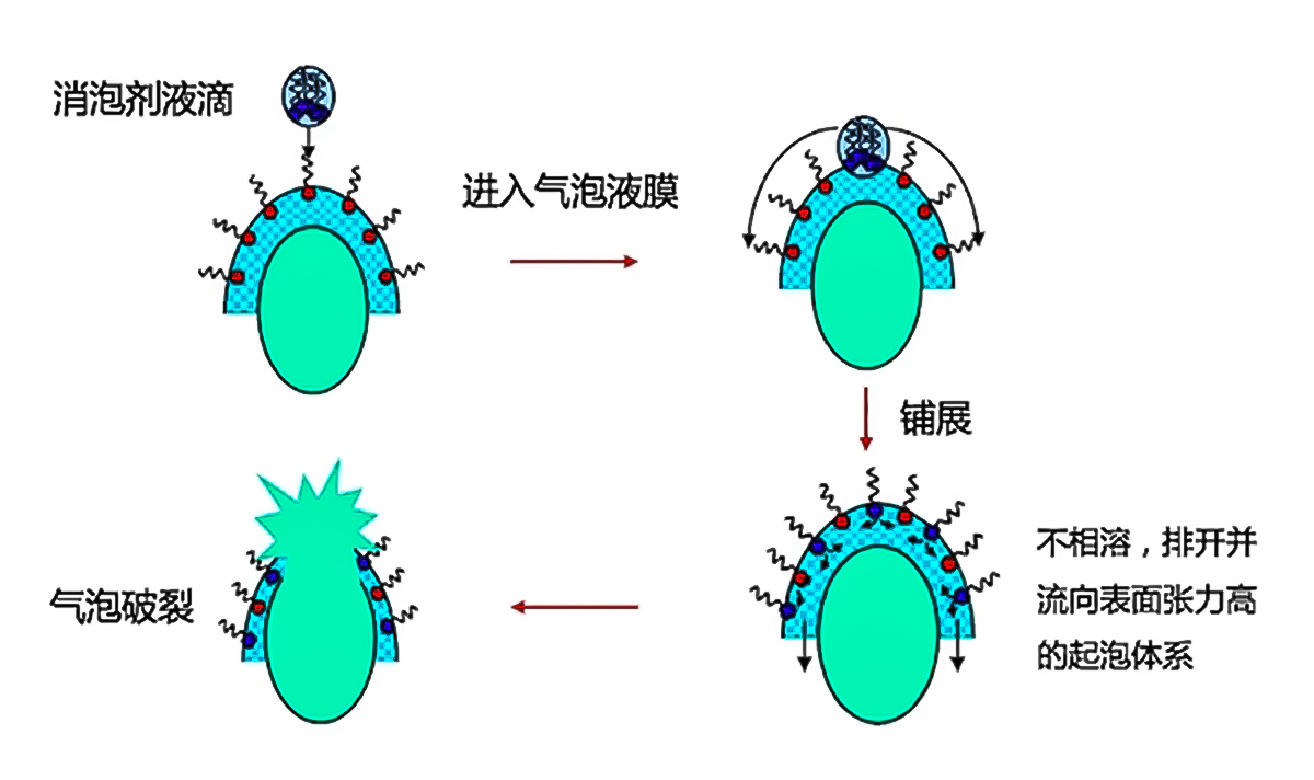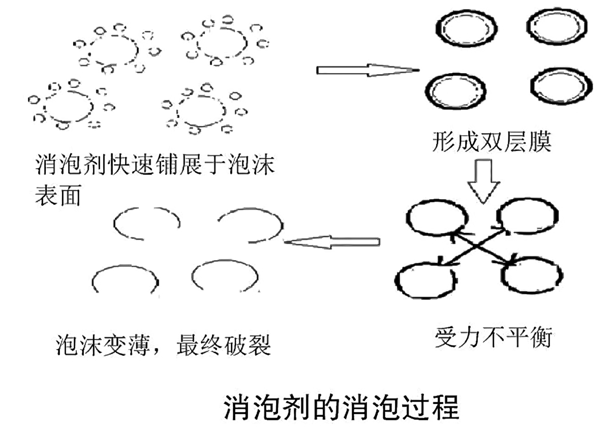 分散均匀的消泡剂渗透进入泡沫薄层并且形成单分子膜,使其附着力降低,易于薄层破裂。