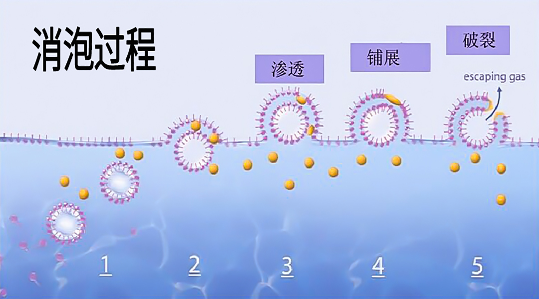 消泡剂的表面张力低,易于进入液膜中并扩展,降低液膜的表面张力,使液膜逐渐变薄,内部受力不均匀,失去自我修复能力从而导致其破裂。