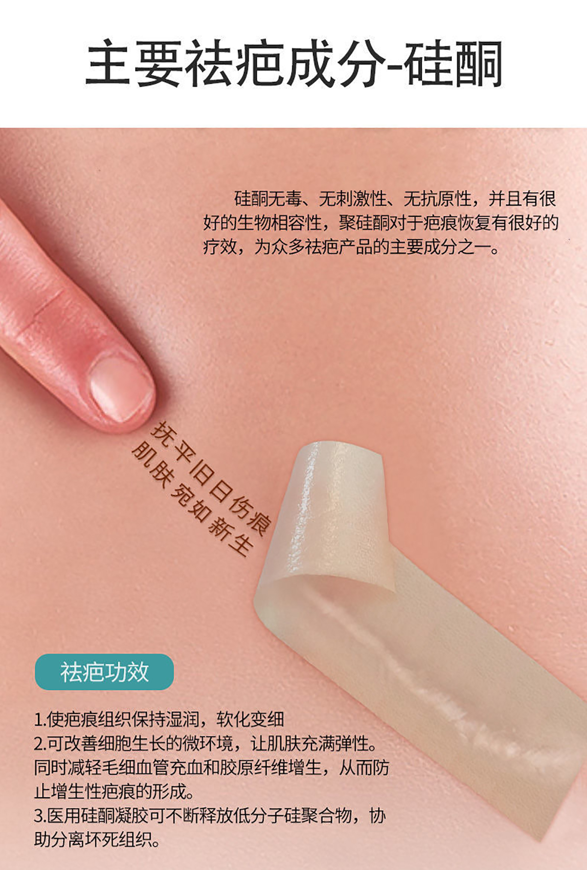 硅胶片,透明柔软但不透水,对皮肤有粘性,能够让疤痕保持一定程度的温度湿度、压力、氧气量等,以软化疤痕,预防疤痕增生,最后达到减淡疤痕的效果。