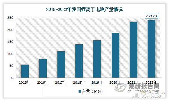 锂离子电池产业是我国重点发展的新能源、新能源汽车和新材料三大产业中的交叉产业,近年国家出台了一系列支持锂离子电池产业的支持政策,直接带动中国锂离子电池市场高速增长。与此同时,随着3C数码产品、智能穿戴产品对锂离子电池需求量的稳定增加,以及新能源汽车的市场规模逐步扩大和储能电池的需求扩大,也带动我国锂离子电池产量规模逐年扩大。2015-2022年我国锂离子电池的产量不断增长。数据显示,2022年我国锂离子电池产量239.28亿只,同比增长2.85%。
